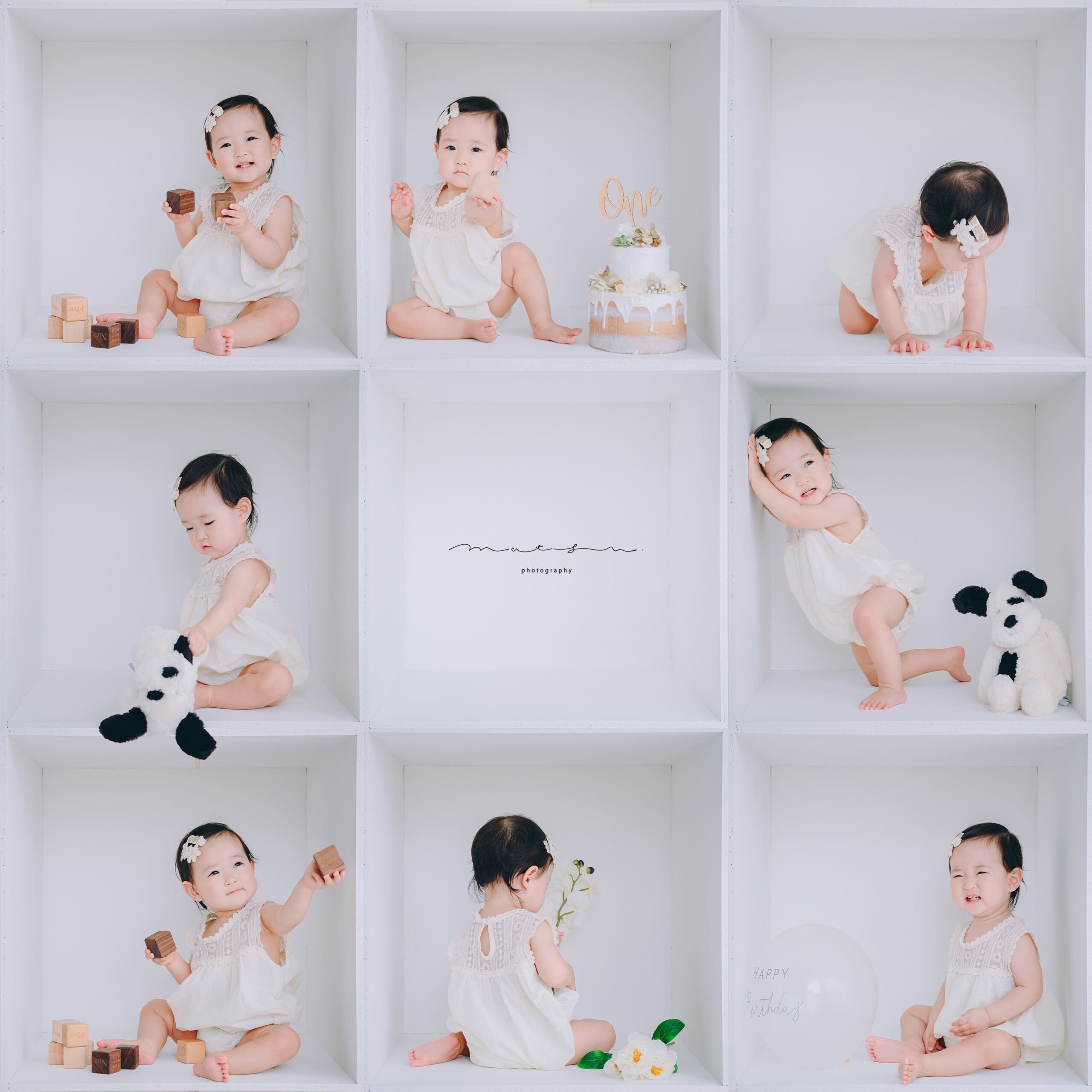 こんにちは🌱今回は1歳のバースデイの撮影会をスタジオで行いました🎂🎉今回は話題のボックスフォト撮影✨お子様がボックスに入っていろんなポーズ